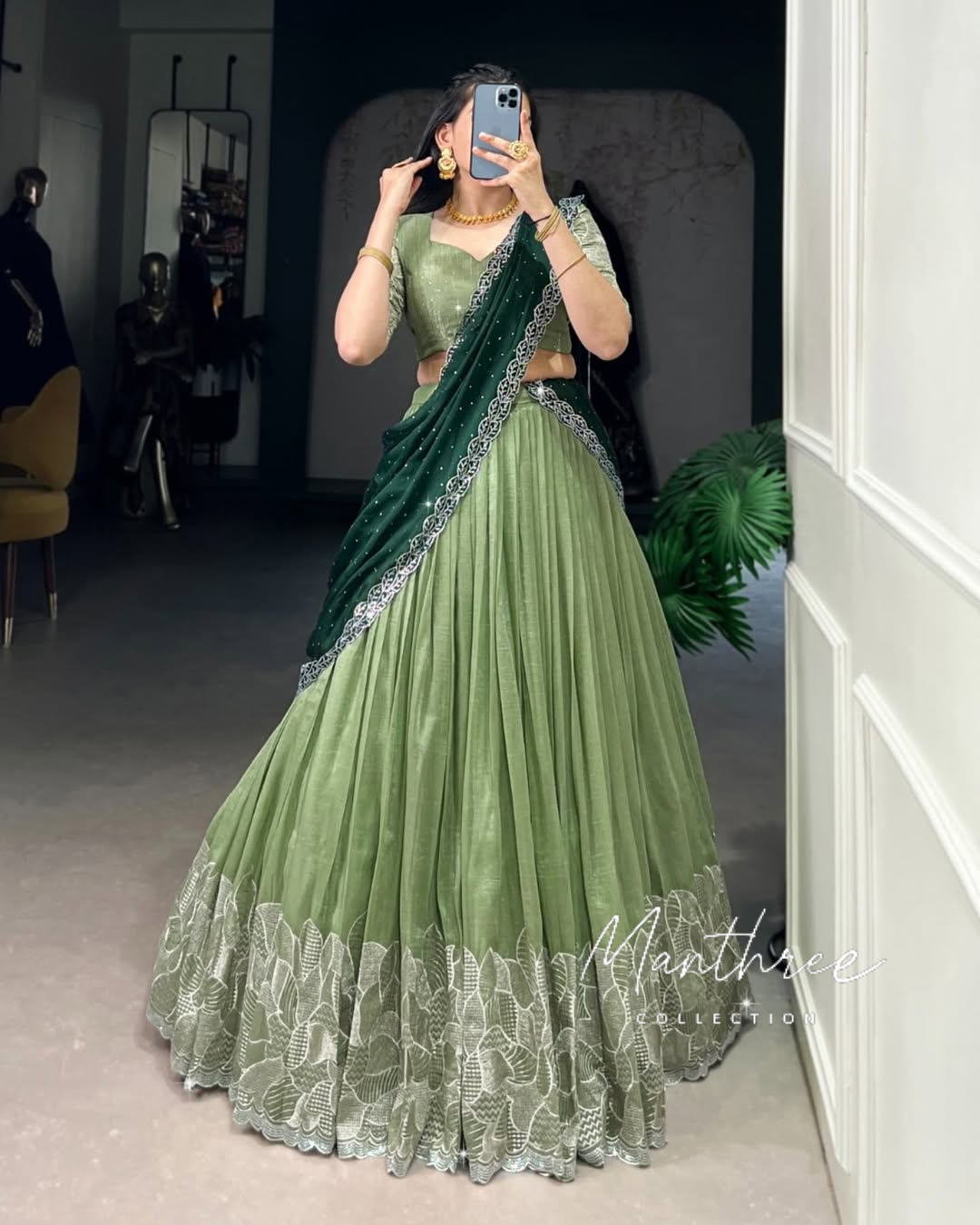 Be the shining star at your Indian wedding with this stunning Indian Pista Bridal Lehenga Choli. Adorned with intricate sequins and thread embroidery, this hotfix lehenga will add a touch of luxury to your special day. Elevate your bridal look with the perfect combination of traditional craftsmanship and modern design.