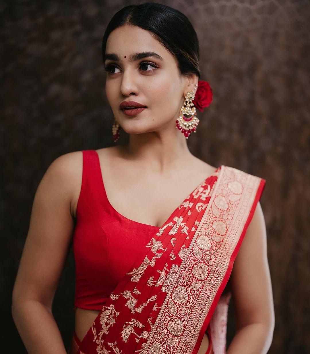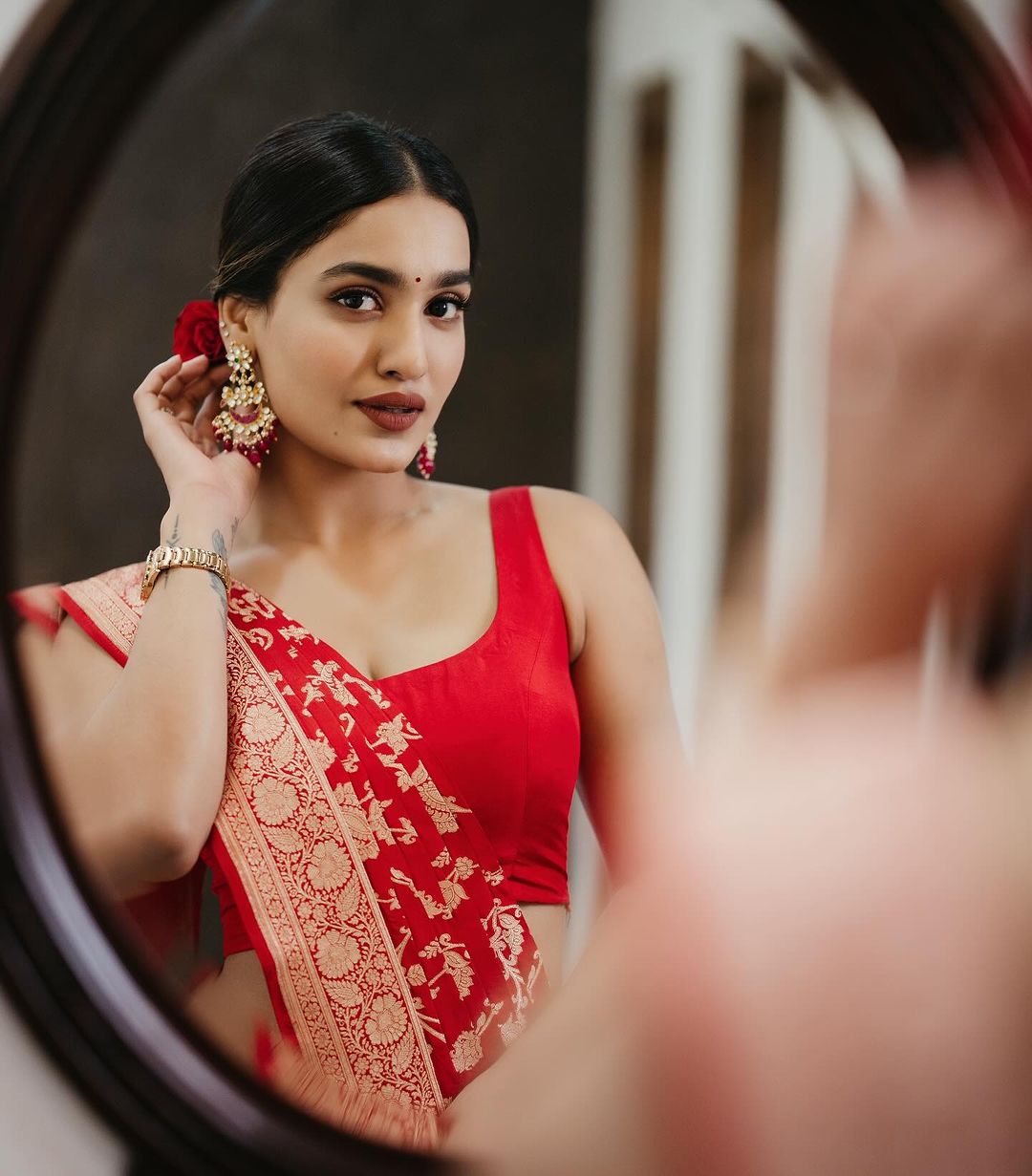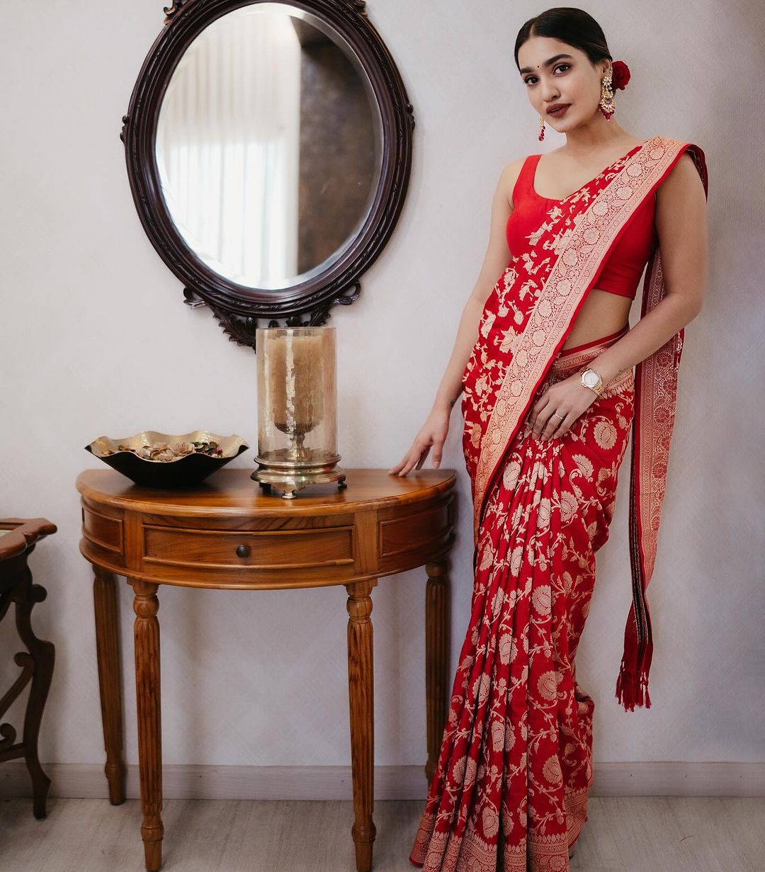 Saniya Iyyapan in red silk saree